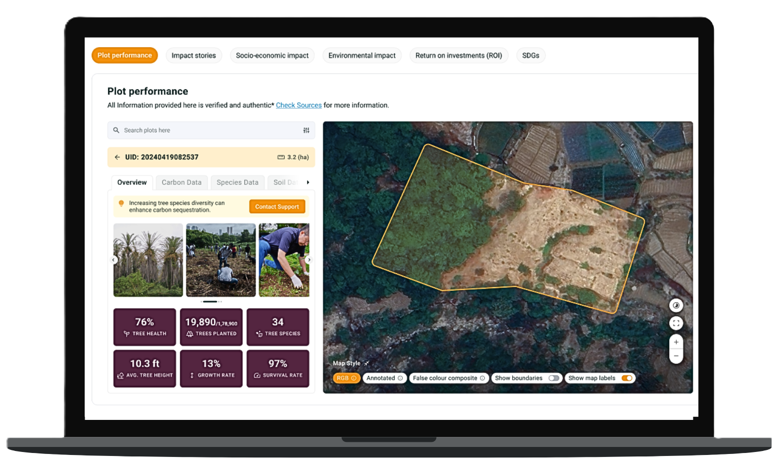 Our impact dashboard visualizes environmental outcomes - tracking survival rates, growth, biodiversity, water savings, and carbon captured. It turns complex data into simple insights for funders, enabling transparent impact reporting